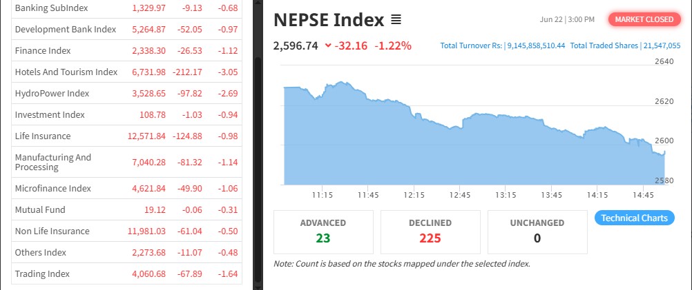 आज २३ कम्पनीको शेयर मूल्य बढेको छ भने २२५ कम्पनीको घटेको छ ।