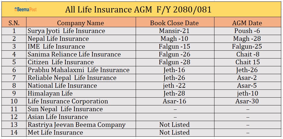 जीवन बीमा कम्पनीतर्फ एशियन लाइफ इन्स्योरेन्स र सन नेपाल लाइफ इन्स्योरेन्स, हिमालयन लाइफ इन्स्योरेन्स र लाइफ इन्स्योरेन्स कर्पोरेशन रहेका छन् । जसमा हिमालयन लाइफ इन्स्योरेन्सले गत आर्थिक वर्षको वार्षिक सभा यहि असार १० गते काठमाडौंको अम्रपाली ब्याक्युटमा आयोजन गर्ने गरी आह्वान गरेको छ । कम्पनीले सो सभा प्रयोजनार्थ जेठ २८ गते एक दिनको लागि बुकक्लोज गरिसकेको छ ।