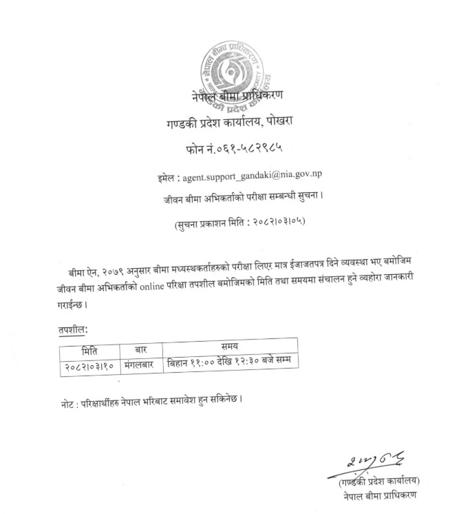 नेपाल बीमा प्राधिकरण गण्डकी प्रदेशले भोलि अभिकर्ता परीक्षा सञ्चालन गर्ने