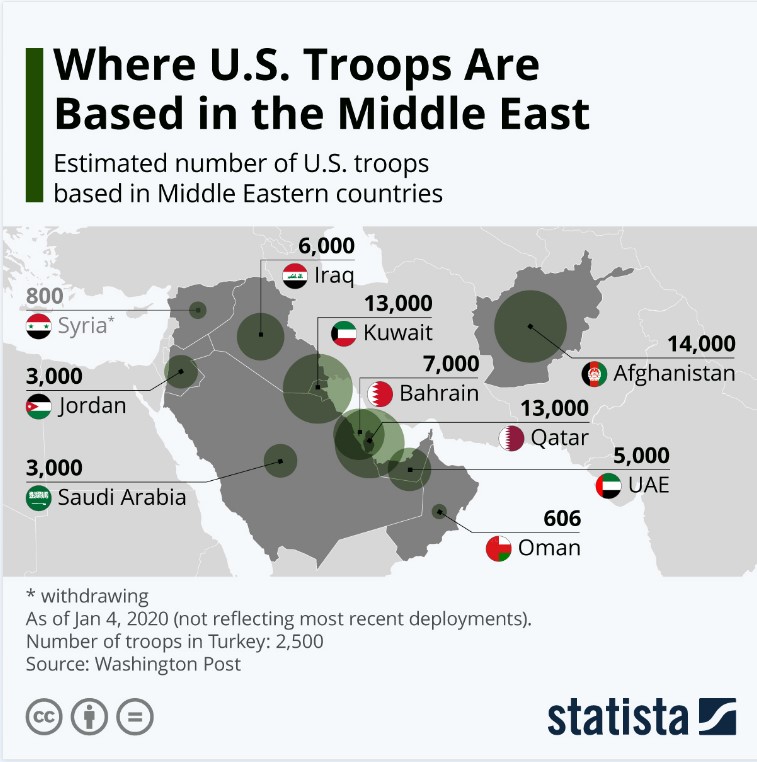 सबैभन्दा धेरै अमेरिकी सेना कतारमा १३ हजार र कुवेतमा १३ हजार रहेका छन् । त्यस्तै साउदी अरबमा तीन हजार, दुबईमा पाँच हजार अमेरिकी सेना तैनाथ गरिएको छ । त्यहाँ अमेरिकाले पहिला देखि नै इरानलाई घेराबन्दीमा पार्न र सूचना संकलन गर्न एयरबेस र सामुन्द्रिक बेस खडा गरेरै बसेको छ ।