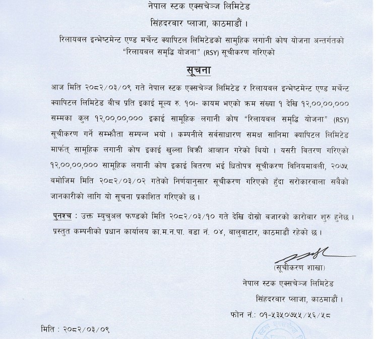 नेप्सेमा ‘रिलायबल समृद्धि योजना’को इकाई सूचीकृत, भोलिदेखि कारोबारमा आउने