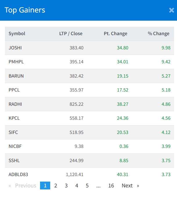 पञ्चकन्या माई हाइड्रोपावरको ९.४२ प्रतिशत, बरुण हाइड्रोपावरको ५.२७ प्रतिशत, पाँचथर पावरको ५.१८ प्रतिशत, राधि विद्युत कम्पनीको ४.८६ प्रतिशतले शेयरमूल्य बृद्धि भएको छ ।