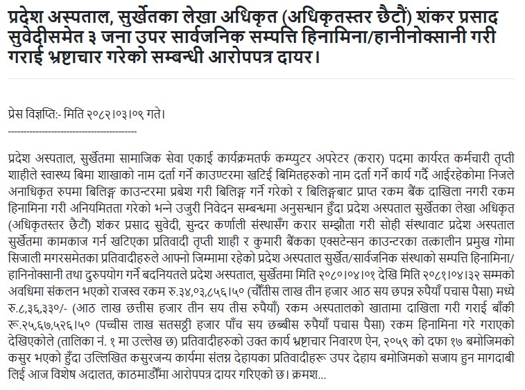 अस्पतालका लेखा अधिकृत शंकरप्रसाद सुवेदी, करारमा कार्यरत कम्प्युटर अपरेटर तृप्ती शाही र कुमारी बैङ्कको एक्स्टेन्सन काउन्टरकी तत्कालीन प्रमुख गोमा सिंजाली मगरविरुद्ध सार्वजनिक सम्पत्ति हानीनोक्सानी गरी भ्रष्टाचार गरेको आरोपमा अख्तियारले सोमबार विशेष अदालतमा मुद्दा दायर गरेको हो ।
