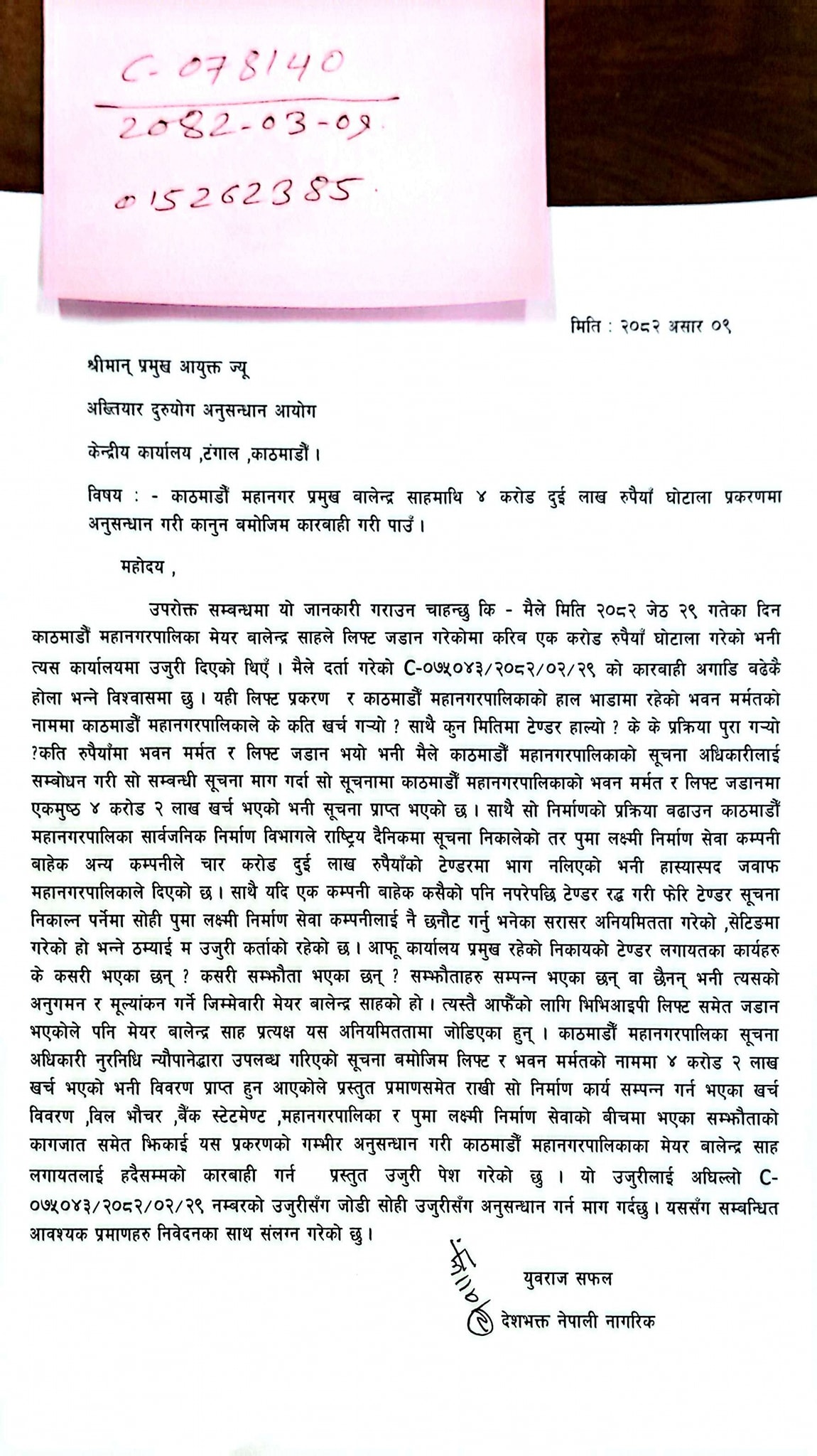 काठमाडौं । काठमाडौं महानगरपालिकाका मेयर बालेन शाहमाथि सार्वजनिक निर्माणमा अनियमितता गरेको आरोप लाग्दै आएको छ। पछिल्लो पटक अधिवक्ता युवराज सफलले ४ करोड २ लाख रुपैयाँ बराबरको भ्रष्टाचार सम्बन्धी नयाँ उजुरी अख्तियार दुरुपयोग अनुसन्धान आयोगमा दर्ता गराएका छन्।