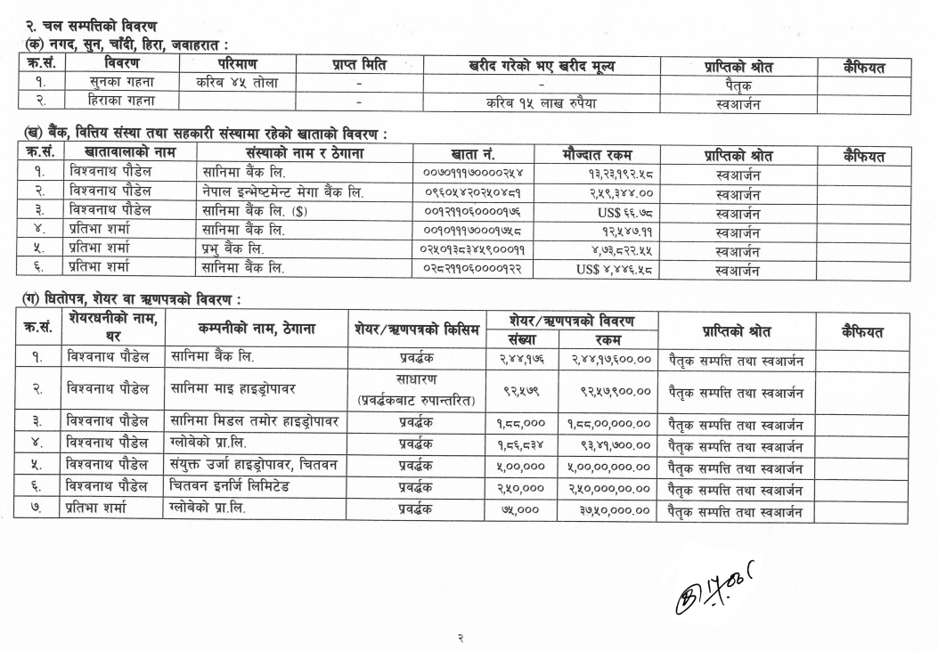 त्यस्तै आफू, श्रीमती र छोराछोरीको नाममा विभिन्न बैंक खातामा २० लाख ६८ हजार रुपैयाँ रहेको विवरणमा उल्लेख गरेका छन्। नगद, सुनचाँदीका अलवा उनले विभिन्न कम्पनीमा सेयर लगानी समेत गरेको विवरणमा उल्लेख छ।