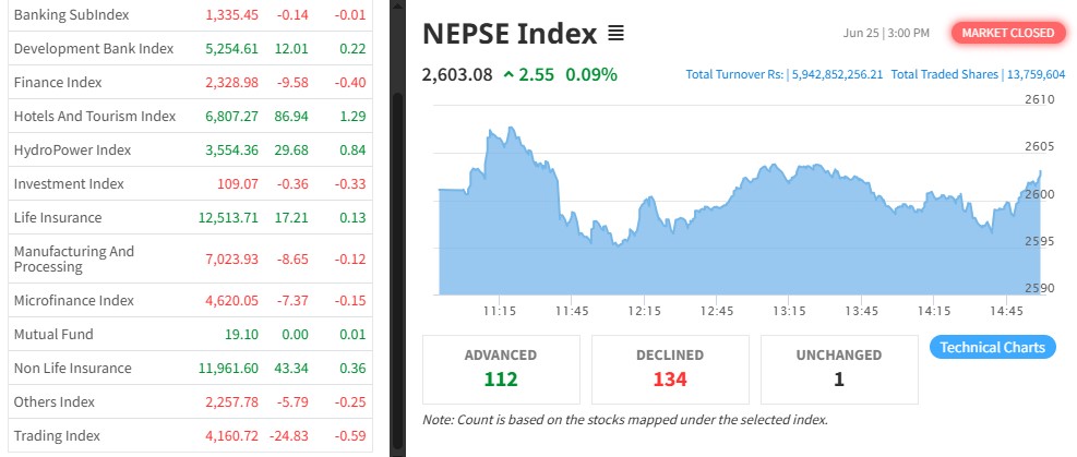 नेपाल स्टक एक्सचेञ्ज (नेप्से) २.५५ अकंले बढेर २६०३.०८ बिन्दुमा कायम भएको छ। आज ३११ कम्पनीको १ करोड ३७ लाख ५९ हजार कित्ता शेयर किनबेच हुँदा ५ अर्ब ९४ करोड रुपैयाँको शेयर कारोबार भएको छ।