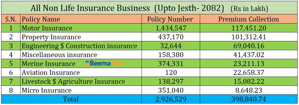 निर्जीवन बीमा कम्पनीहरुले मोटर, सम्पत्ति, इन्जिनियर तथा ठेक्का जोखा, लघु, हवाई, सामून्द्रिक, कृषि तथा बाली, लघु लगायतका बीमा पोलिसी बिक्री वितरण गर्दै आएका छन् । विवरण अनुसार चालु आवको ११ महिनामा कम्पनीहरुले मोटर र सम्पत्ति बीमा मार्फत सर्वाधिक प्रिमियम कलेक्सन गरेका छन् ।