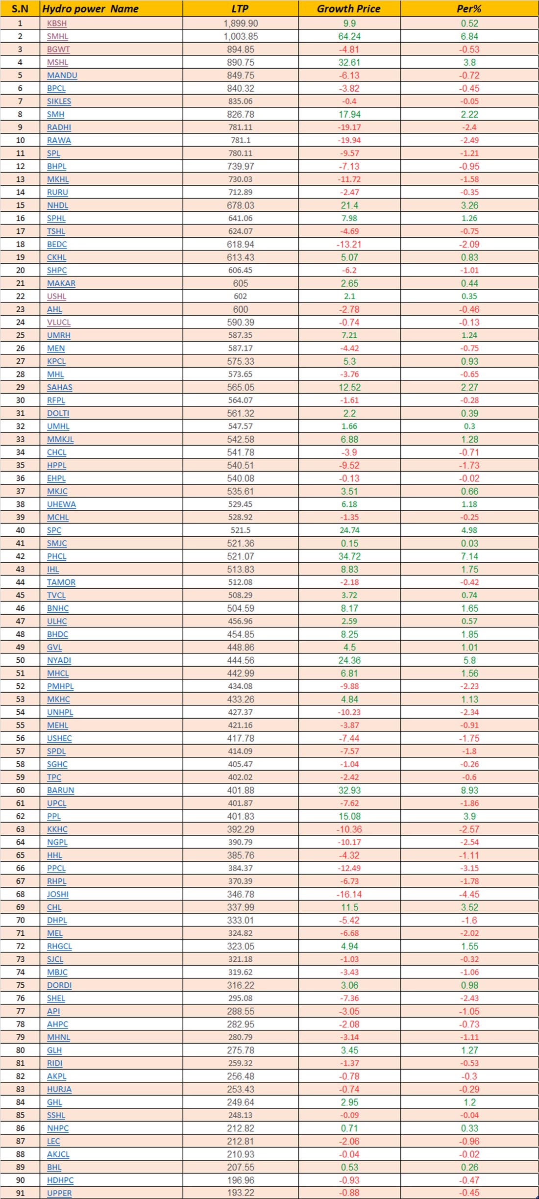 नेपाल स्टक एक्सचेन्ज (नेप्से) अन्तर्गत हाइड्रोपावर समूहको परिसूचकमा यस साताको अन्तिम कारोबार दिन बिहिबार ३.८३ अंकले वृद्धि भई ३५५२.२२ बिन्दुमा पुगेको छ । उक्त दिन कुल ३८ कम्पनीको शेयर मूल्यमा वृद्धि देखिएको छ भने ५३ कम्पनीको मूल्य घटेको छ ।