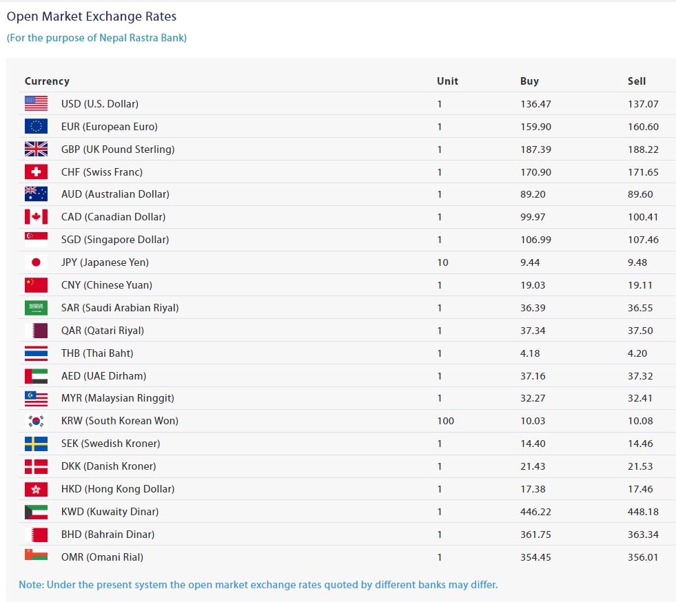 त्यसैगरी १० जापानिज यनको खरीददर ९.४४ रुपैयाँ र बिक्रीदर ९.४८ रुपैयाँ, कतारी रियाल एकको खरीददर ३७.३४ रुपैयाँ र बिक्रीदर ३७.५० रुपैयाँ, यूएई दिराम एकको खरीददर ३७.१६ रुपैयाँ र बिक्रीदर ३७.५० रुपैयाँ तोकिएको छ।