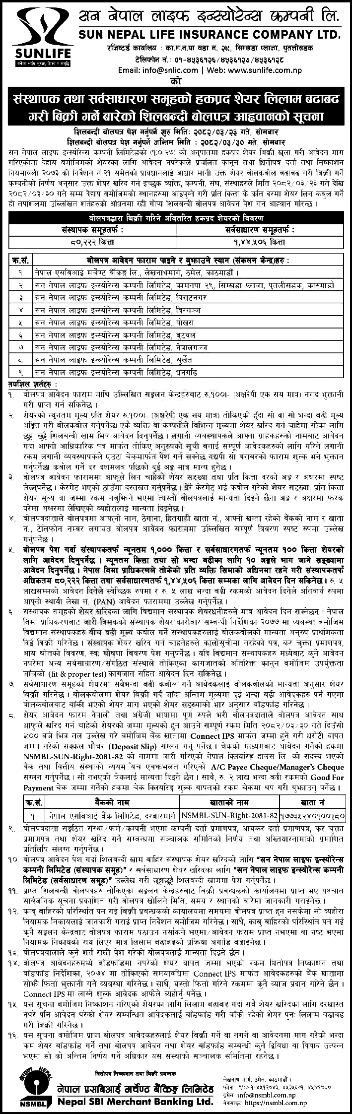 आवेदन यही असार २३ गतेदेखि ३० गतेभित्र पेश गरिसक्नु पर्नेछ। यस्तो आवेदन फाराम नेपाल एसबिआई मर्चेण्ट बैंकिङ्गको ठमेल कार्यालय, सन नेपाल लाइफको पुतलीसडक कार्यालय र सन नेपाल लाइफकै बिराटनगर, वीरगंज, पोखरा, बुटवल, नेपालगंज, सुर्खेत र धनगढी शाखा कार्यालयमा पाइनेछ।