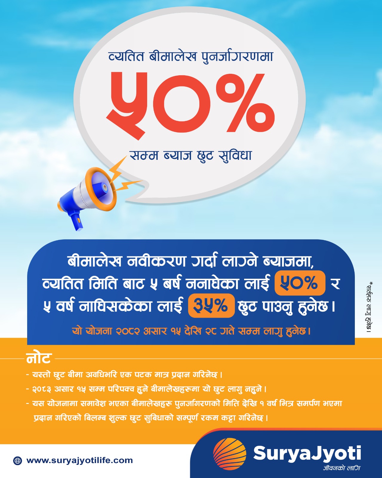 सूर्यज्योति लाइफको विशेष योजना: व्यतित बीमालेख पुनर्जागरणमा ५० प्रतिशतसम्म छुट