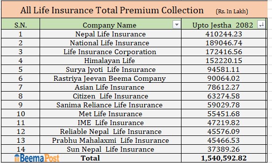 बीमा प्राधिकरणको तथ्यांक अनुसार सूर्यज्योति लाइफले ९ अर्ब ४५ करोड रुपैयाँ, सरकारी स्वामित्वमा रहेको राष्ट्रिय जीवन बीमा कम्पनीले ९ अर्ब, एशियन लाइफले ७ अर्ब ८६ करोड रुपैयाँ, सिटिजन लाइफले ६ अर्ब ३२ करोड रुपैयाँ, सानिमा रिलायन्स लाइफले ५ अर्ब ९० करोड रुपैयाँ, मेट लाइफले ५ अर्ब ५४ करोड ५रुपैयाँ कुल बीमाशुल्क आर्जन गर्न सफल भएका छन् ।