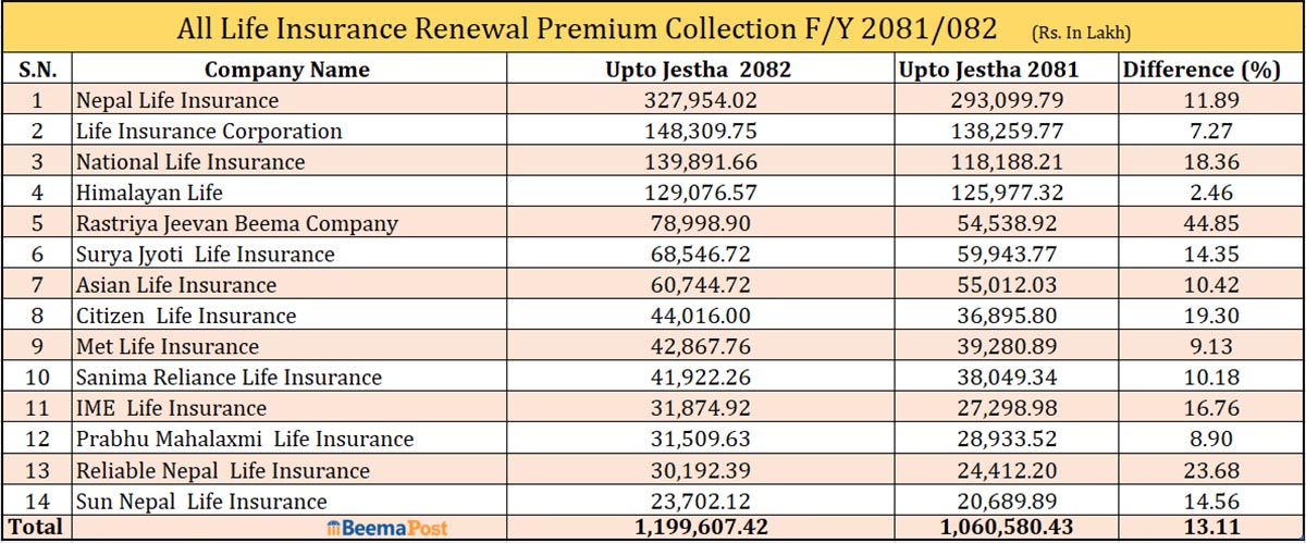 कम्पनीहरुले आर्जन गरेको नविकरण बीमा शुल्क गत आर्थिक वर्षको सोहि अवधिको तुलनामा १३.११ प्रतिशतले बढी हो । गत आर्थिक वर्षको जेठ मसान्तसम्मको अवधिमा जीवन बीमा कम्पनीहरुले १ खर्ब ६ अर्ब ५ करोड ८० लाख रुपैयाँ नविकरण बीमा शुल्क आर्जन गरेका थिए ।