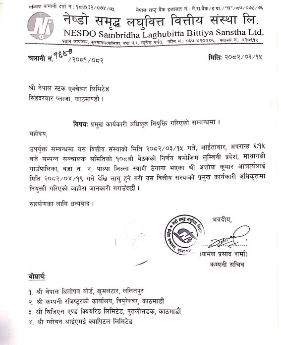काठमाडौं । नेष्डो समृद्ध लघुवित्त वित्तीय संस्था लिमिटेडको प्रमुख कार्यकारी अधिकृत (सीईओ) मा अशोक कुमार आचार्य नियुक्त भएका छन् ।