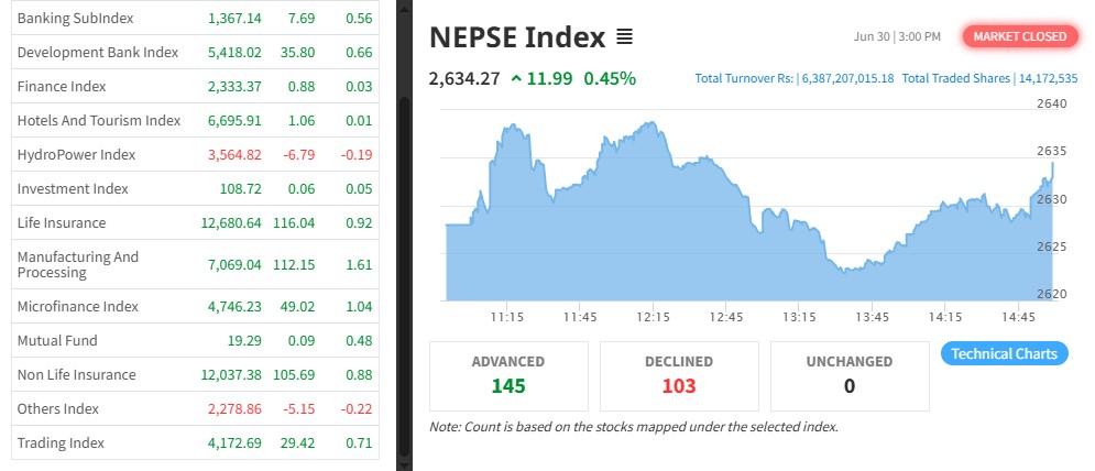 नेपाल स्कट एक्सचेञ्ज (नेप्से) ११.९९ अकंले बढेर २६३४.२७ बिन्दुमा कायम भएको छ । आज ३१८ कम्पनीको १ करोड ४१ लाख ७२ हजार कित्ता शेयर किनबेच हुँदा ६ अर्ब ३८ करोड ७२ लाख रुपैयाँको शेयर कारोबार भएको छ ।