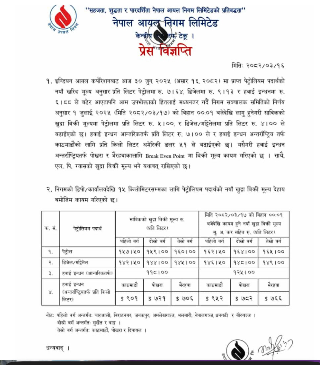 त्यस्तै, मट्टितेल र डिजेलमा ४ रुपैयाँले मूल्य बढेको निगमले विज्ञप्ति जारी गर्दै जानकारी गराएको छ ।