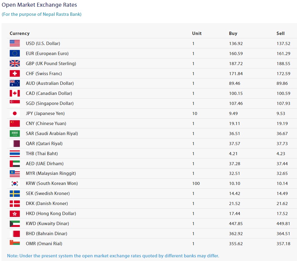 यसदिन अष्ट्रेलियन डलरको खरीददर ८९.४६ रुपैयाँ र बिक्रीदर ८९.८६ रुपैयाँ, १० जापानिज यनको खरीददर ९.४९ रुपैयाँ र बिक्रीदर ९.५३ रुपैयाँ, कतारी रियालको खरीददर ३७.५७ रुपैयाँ र बिक्रीदर ३७.७३ रुपैयाँ कायम भएको छ।