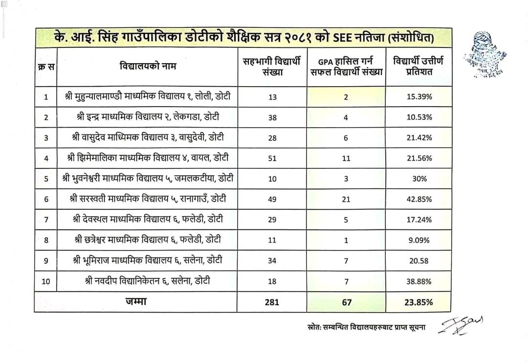 काठमाडौं । डोटी जिल्लाको के आई सिंह गाउँपालिकाको शैक्षिक सत्र २०८१ को एसईई नतिजा निराशाजनक रहेको छ । गाउँपालिकाको शिक्षा शाखाले सार्वजनिक गरेको विवरण अनुसार विद्यार्थीहरूको सुनौलो भविष्य मेरुदण्डको रुपमा हेरिएको एसईई परीक्षामा २३.८६ प्रतिशतमात्र विद्यार्थीले उत्तीर्ण भएका हुन् ।