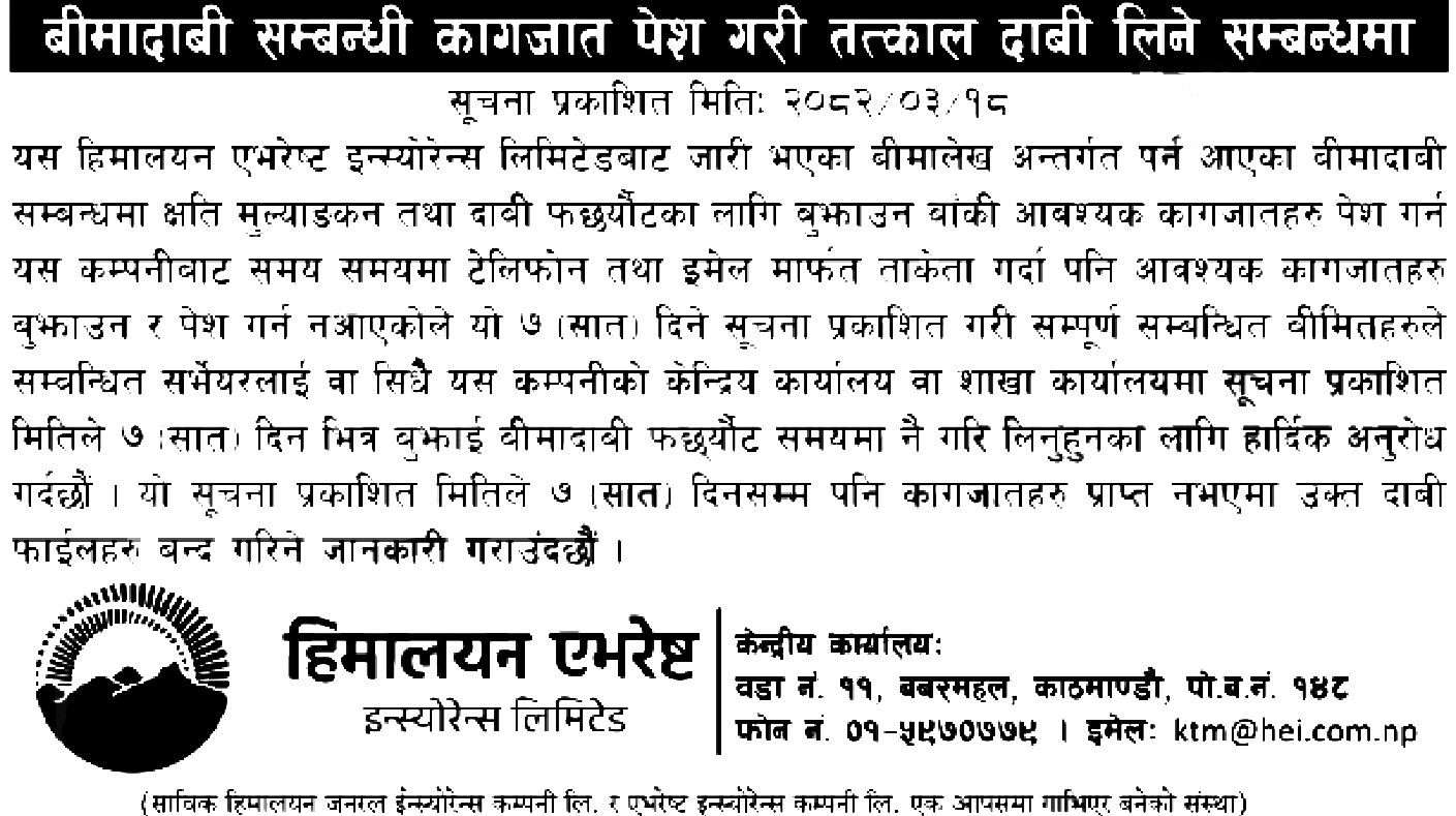 काठमाडौं । हिमालयन एभरेष्ट इन्स्योरेन्स लिमिटेडले बीमितलाई अपुग कागजात पेश गरी दाबी भुक्तानी लिन आग्रह गरेको छ।