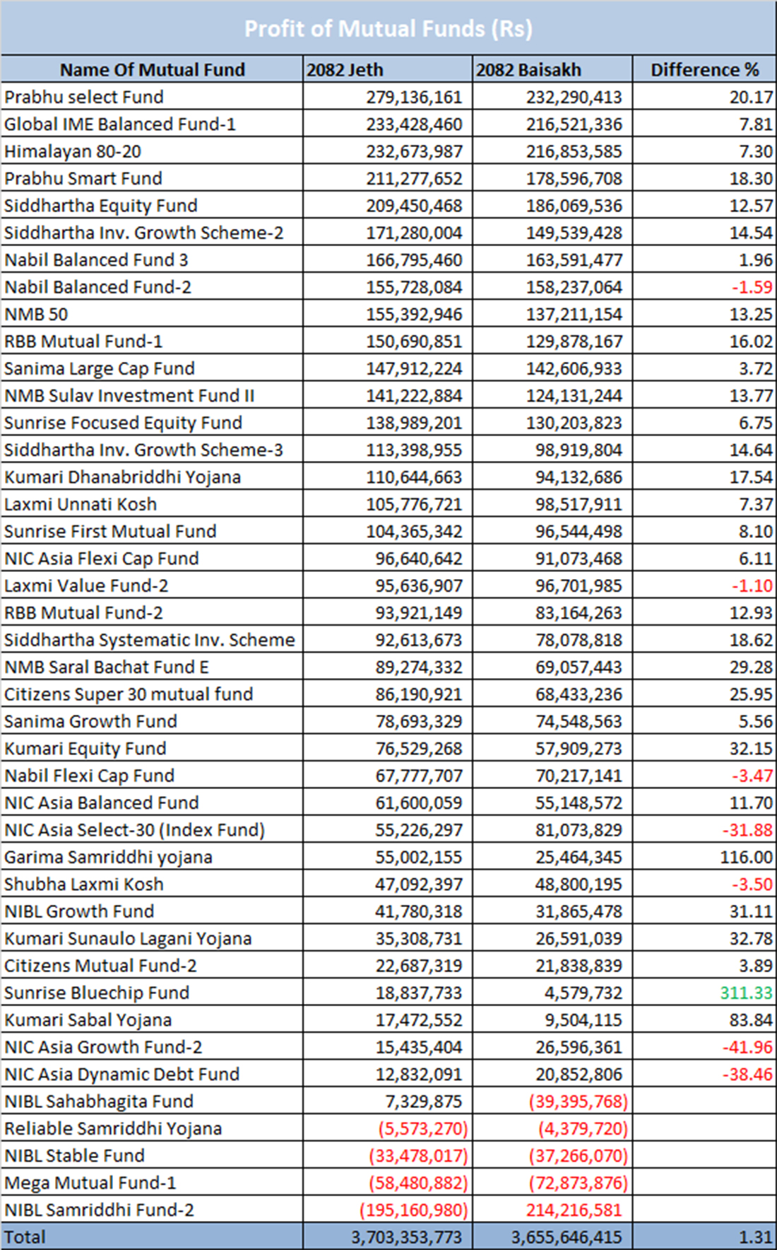जेठ महिनामा अधिकांश म्युचुअल फन्डहरूको नाफा बढेको छ । सर्वाधिक नाफा कमाउने फन्ड प्रभू सेलेक्ट फन्ड हो, जसले एकै महिनामा २७ करोड ९१ लाख रुपैयाँ नाफा कमाएको छ, जुन वैशाखको तुलनामा २० प्रतिशतभन्दा बढी हो ।