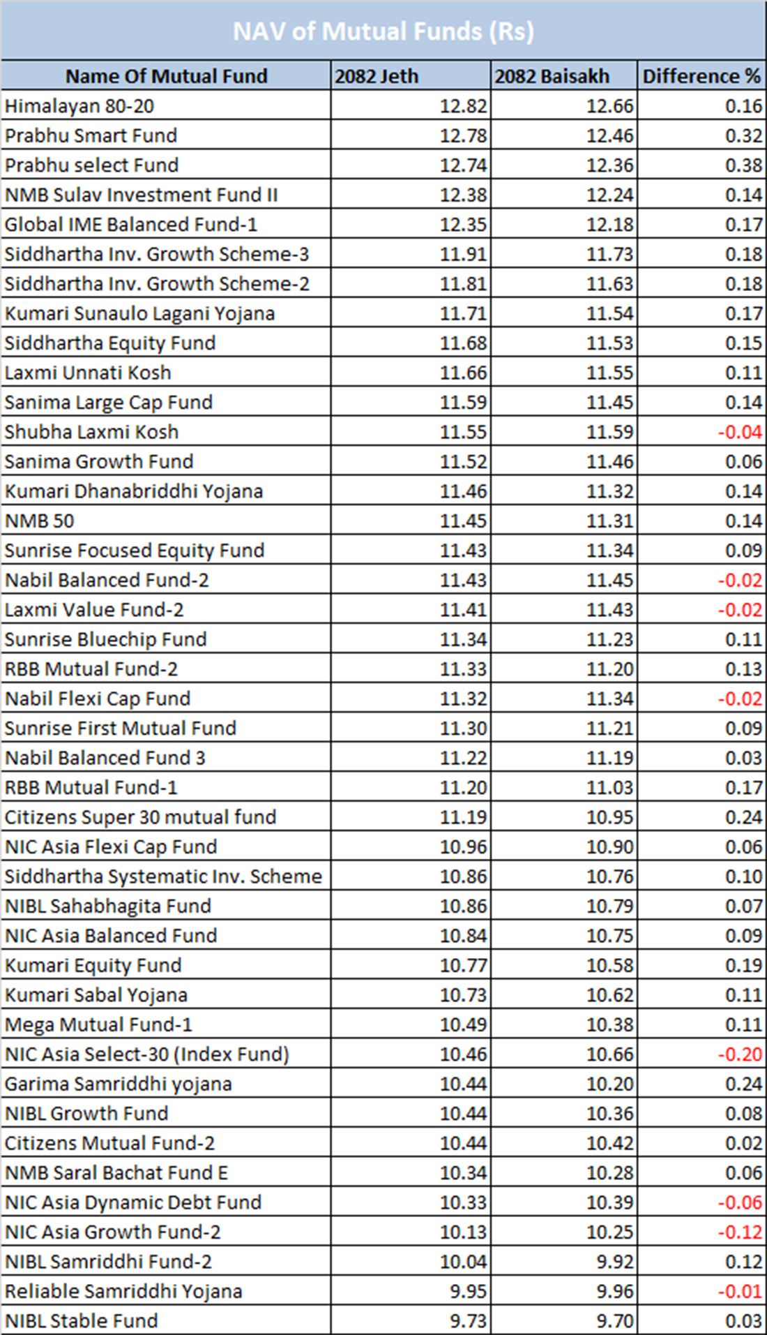 २० वटा फन्डको न्याभ ११ रुपैयाँभन्दा माथि छ भने १५ वटा फन्डको न्याभ १० रुपैयाँभन्दा बढी रहेको छ ।