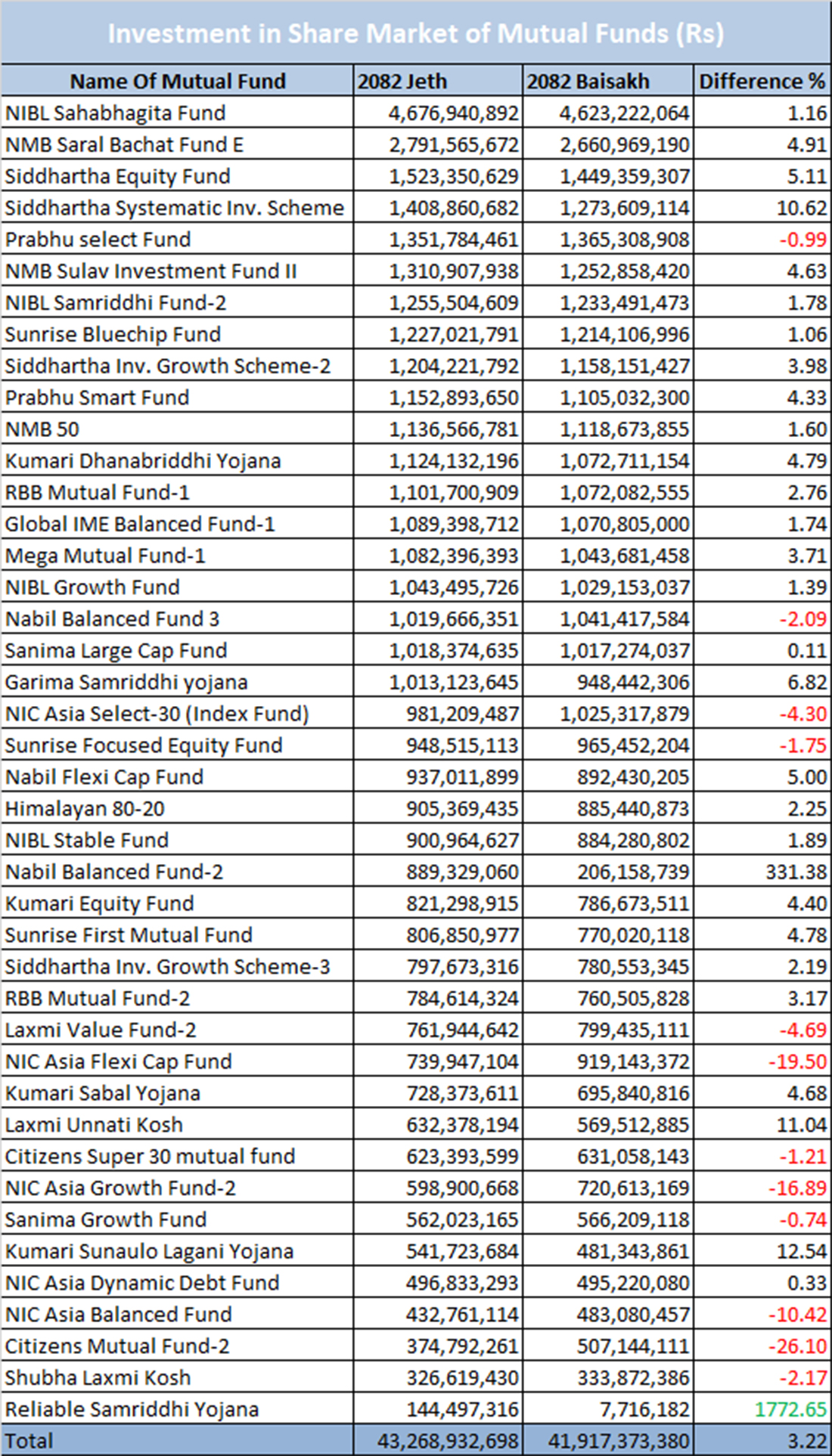 जेठ महिनामा म्युचुअल फन्डहरूले शेयर बजारमा गरेको लगानी ३.२२ प्रतिशतले वृद्धि भएको छ । वैशाख महिनासम्म फन्डहरूले कुल ४१ अर्ब ९१ करोड रुपैयाँभन्दा बढी लगानी गरेका थिए भने जेठको अन्त्यसम्ममा यो रकम बढेर ४३ अर्ब २६ करोड रुपैयाँ पुगेको छ । यसरी फन्डहरूले एक महिनामै १ अर्ब ३५ करोड रुपैयाँ बराबरको शेयर थप खरिद गरेका छन् ।