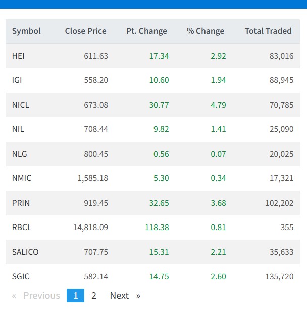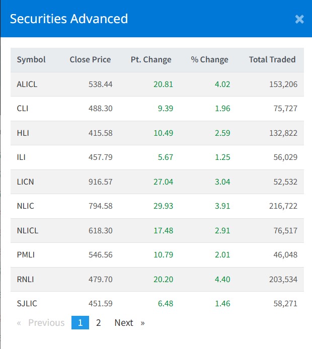 लाइफ इन्स्योरेन्स तर्फ एशियन लाइफको ४.०२ प्रतिशत, सिटिजन लाइफको १.९६ प्रतिशत, हिमालयन लाइफको २.५९ प्रतिशत, आइएमई लाइफको १.२५ प्रतिशत, एलआइसी नेपालको ३.०४ प्रतिशत, नेपाल लाइफको ३.९१ प्रतिशत, नेशनल लाइफको २.९१ प्रतिशत, प्रभु महालक्ष्मी लाइफको २.०१ प्रतिशत, रिलायबल नेपाल लाइफको ४.४० प्रतिशत, सूर्यज्योति लाइफको १.४६ प्रतिशत, सन नेपाल लाइफको ३.६८ प्रतिशत, सानिमा रिलायन्स लाइफको १.६१ प्रतिशतले शेयरमूल्य बृद्धि भएको छ ।