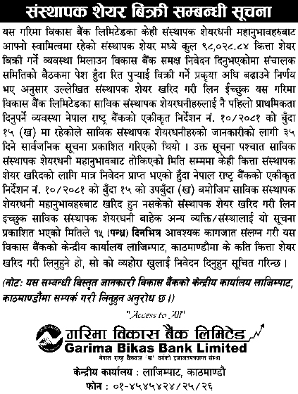 काठमाडौं । गरिमा विकास बैंक लिमिटेडले ९८ हजार २८.८४ कित्ता संस्थापक शेयर बिक्रीमा राखेको छ।