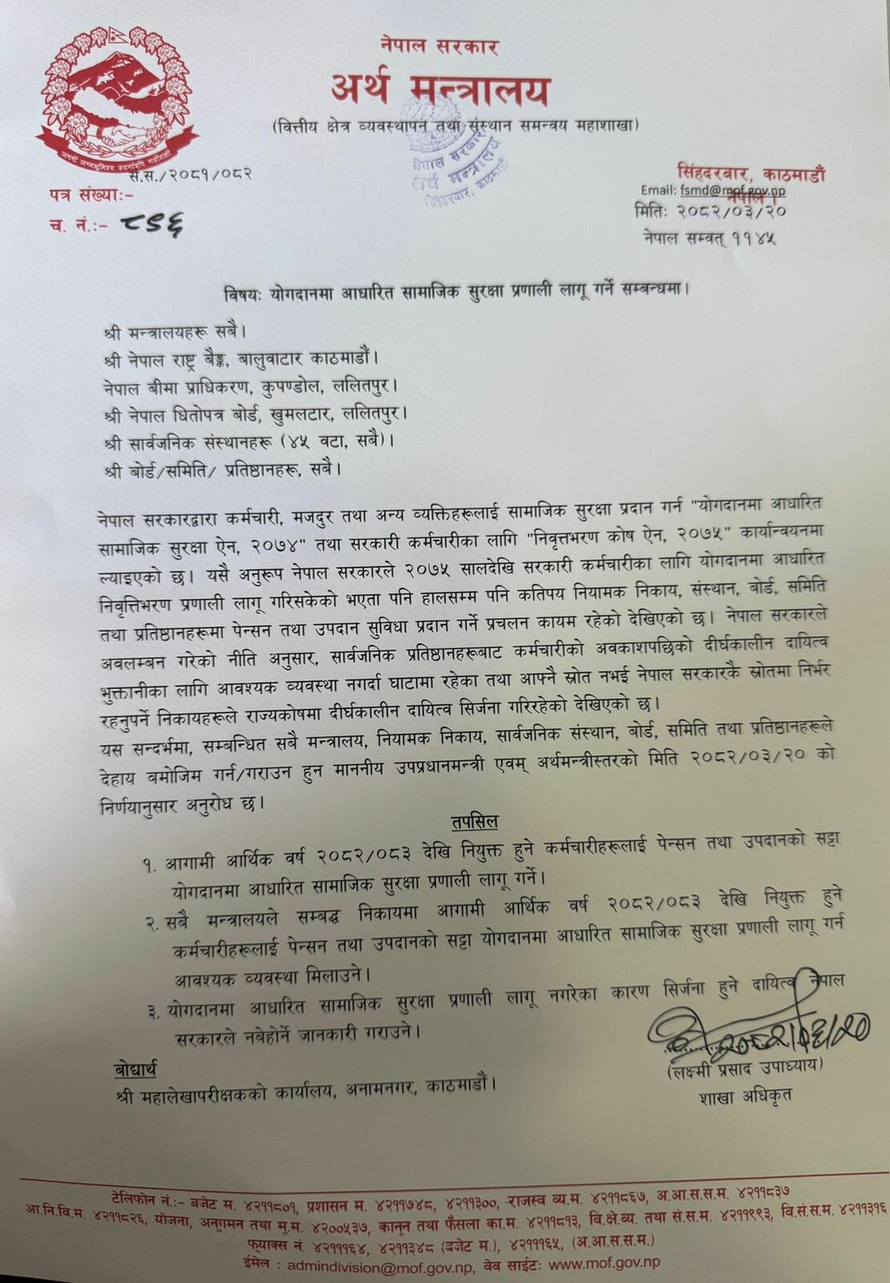 साउनदेखि नियुक्त हुने कर्मचारीले पेन्सन तथा उपदान नपाउने, सामाजिक सुरक्षा प्रणाली लागू