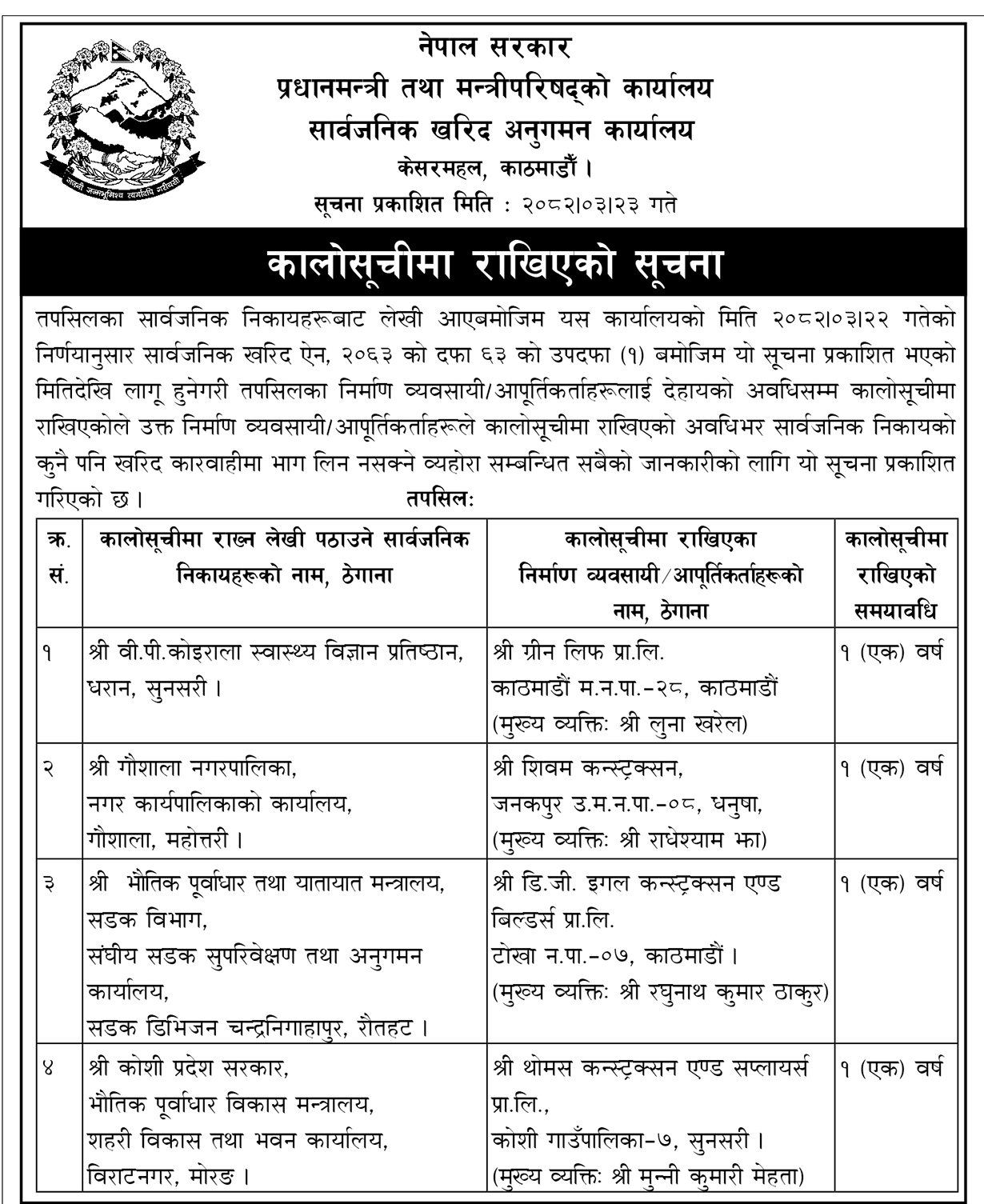 कालोसूचीमा परेका कम्पनीमध्ये काठमाडौंस्थित श्री ग्रीन लिफ प्रा. लि. लाई बीपी कोइराला स्वास्थ्य विज्ञान प्रतिष्ठान, धरानको सिफारिसमा कारबाही गरिएको हो। कम्पनीका मुख्य व्यक्ति लुना खरेल रहेका छन्। त्यसैगरी महोत्तरीको गौशाला नगरपालिकाको सिफारिसमा जनकपुरस्थित श्री शिवम कन्स्ट्रक्सन पनि कारबाहीमा परेको छ, जसका प्रमुख राधेश्याम झा हुन्।