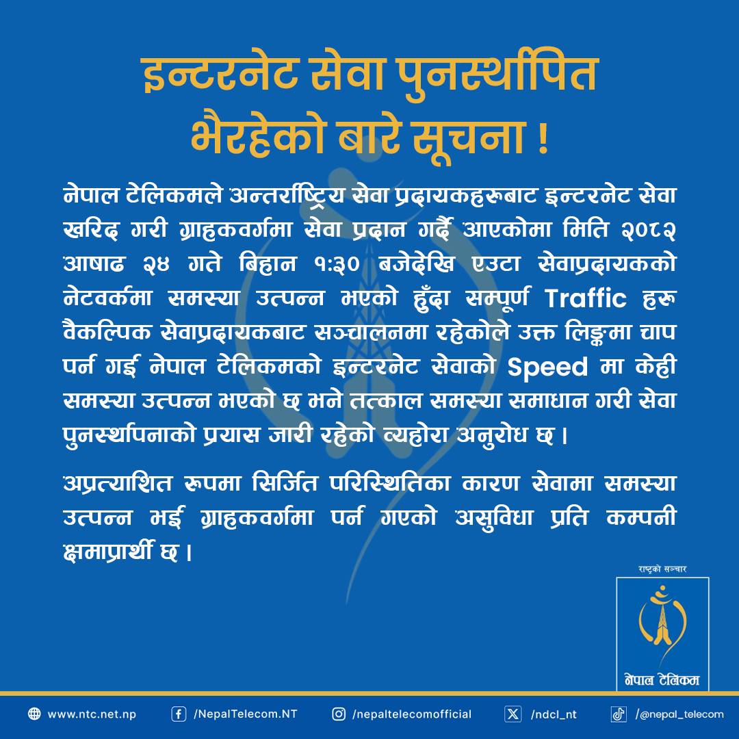यसकारण वैकल्पिक नेटवर्कमा अचानक बढेको चापले नेपाल टेलिकमको इन्टरनेट सेवा स्पीडमा अस्थायी प्रभाव परेको छ। नेपाल टेलिकमले यो समस्या तुरुन्त समाधान गरी सेवा पुनःस्थापना गर्ने काम जारी राखेको जनाएको छ।