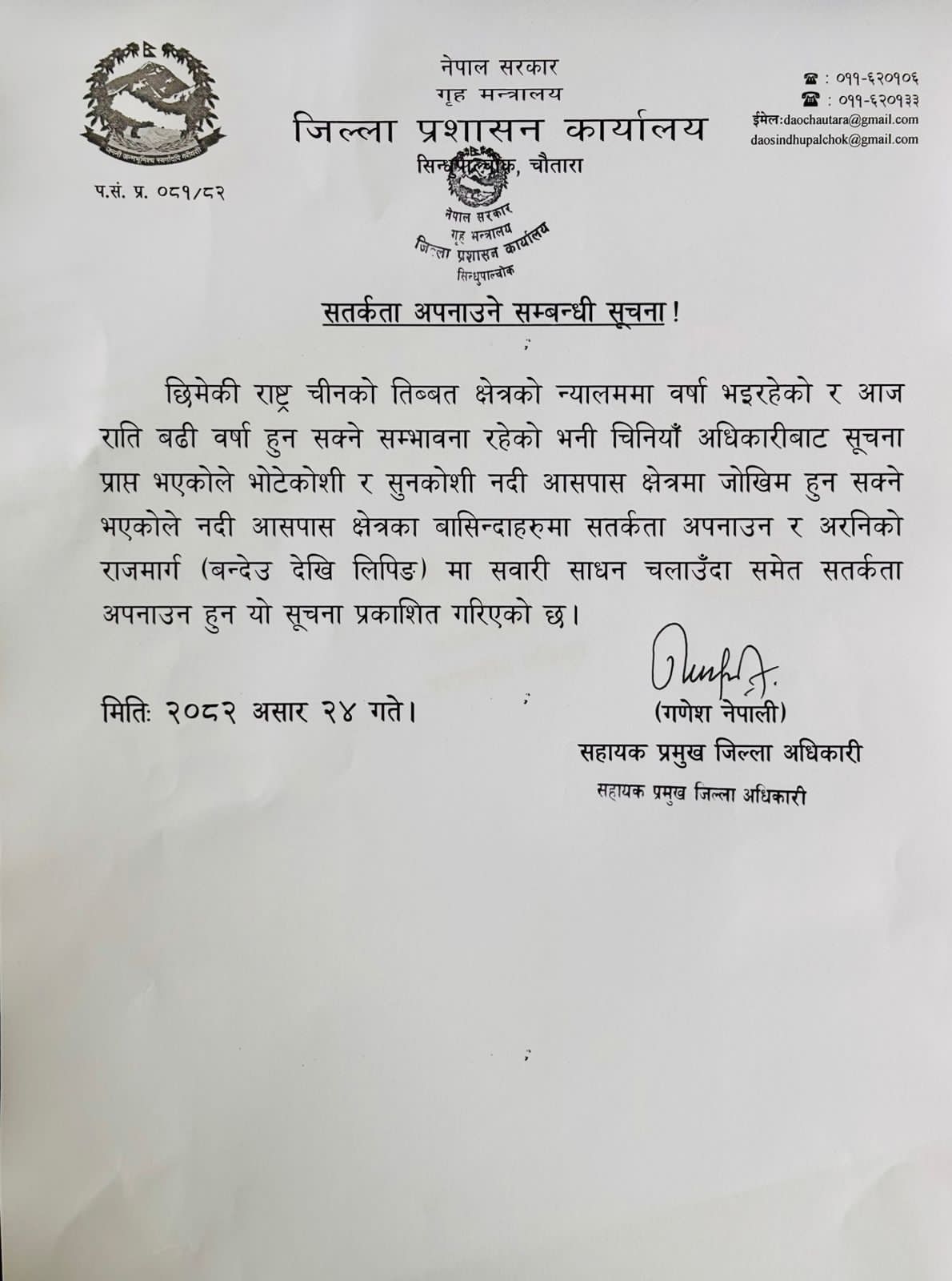 चिनियाँ अधिकारीबाट आएको सूचनाका आधारमा संभावित जोखिमलाई ध्यानमा राख्दै प्रशासनले नदी किनारमा बसोबास गर्ने नागरिकहरूलाई विशेष सतर्कता अपनाउन अनुरोध गरेको हो। साथै, अरनिको राजमार्गको बन्देउदेखि लिपिङसम्मको खण्डमा सवारी साधन सञ्चालन गर्दा पनि उच्च सावधानी अपनाउन आग्रह गरिएको छ।