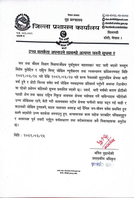 काठमाडौँ ।  जल तथा मौसम विज्ञान विभागको मनसुन विशेष बुलेटिन तथा राष्ट्रिय विपद् जोखिम न्यूनीकरण तथा व्यवस्थापन प्राधिकरणको प्रक्षेपण अनुसार सुदूरपश्चिम क्षेत्रका विभिन्न जिल्लामा आगामी दिनहरूमा भारी वर्षा हुने सम्भावना रहेको जनाइएको छ। डोटी जिल्ला समेत उच्च जोखिमयुक्त क्षेत्रमा परेको भन्दै जिल्ला प्रशासन कार्यालय डोटीले उच्च सतर्कता अपनाउन आग्रह गरेको हो।