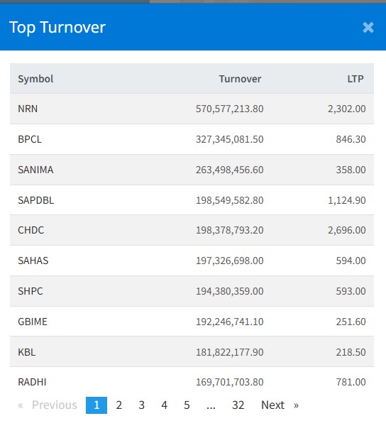 आज नेपाल इन्फ्रास्टक्चरको सबैभन्दा बढी कारोबार भएको छ । यसदिन कम्पनीको ५७ करोड पाँच लाख ७७ हजार रुपैयाँको कारोबार भएको छ । त्यस्तै, बुटवल पावरको ३२ करोड ७३ लाख रुपैयाँ, सानिमा बैंकको २६ करोड ३४ लाख रुपैयाँ, सप्तकोशी विकास बैंकको १९ करोड ८५ लाख रुपैयाँको शेयर कारोबार भएको छ ।