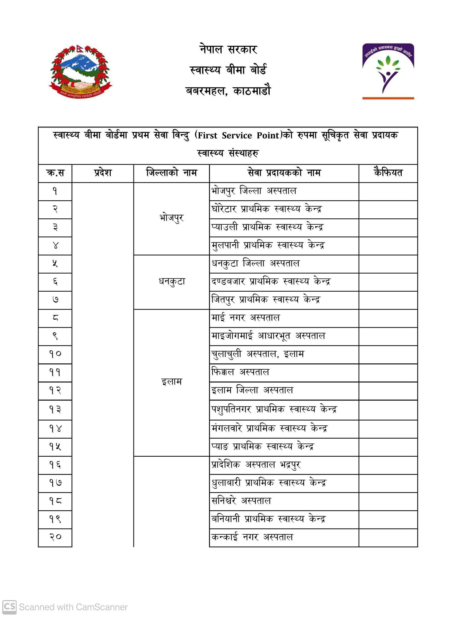 बीमा बोर्डले देशभरी रहेका विभिन्न जिल्लाका सरकारी अस्पताल, स्वास्थ्य केन्द्र लगायतका संस्थालाई बीमाको अनुमति दिएर सूचीकृत गरेको छ ।