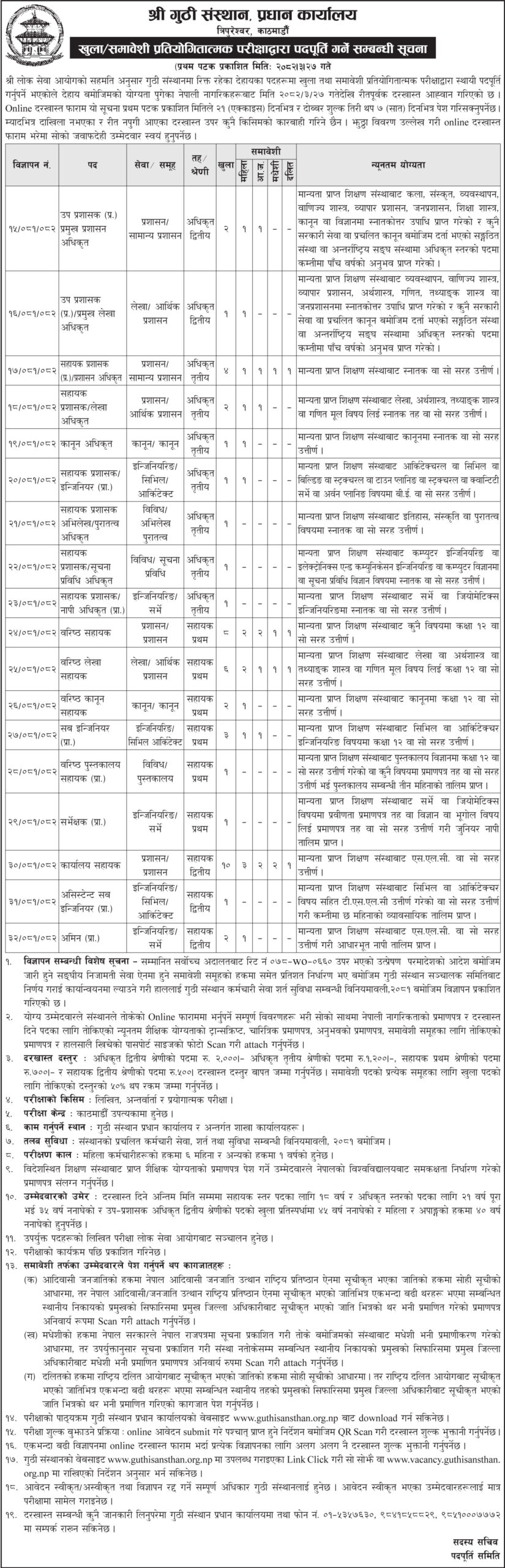 काठमाडौं । काठमाडौंको त्रिपुरेश्वरमा प्रधान कार्यालय रहेको श्री गुठी संस्थानले ठूलो संख्यामा आवेदन खुलाएको छ। संस्थानले खुला तथा समावेशी प्रतियोगिताद्वारा पदपूर्ति गर्नेगरी ८२ जनाको लागि आवेदन खुलाएको हो।