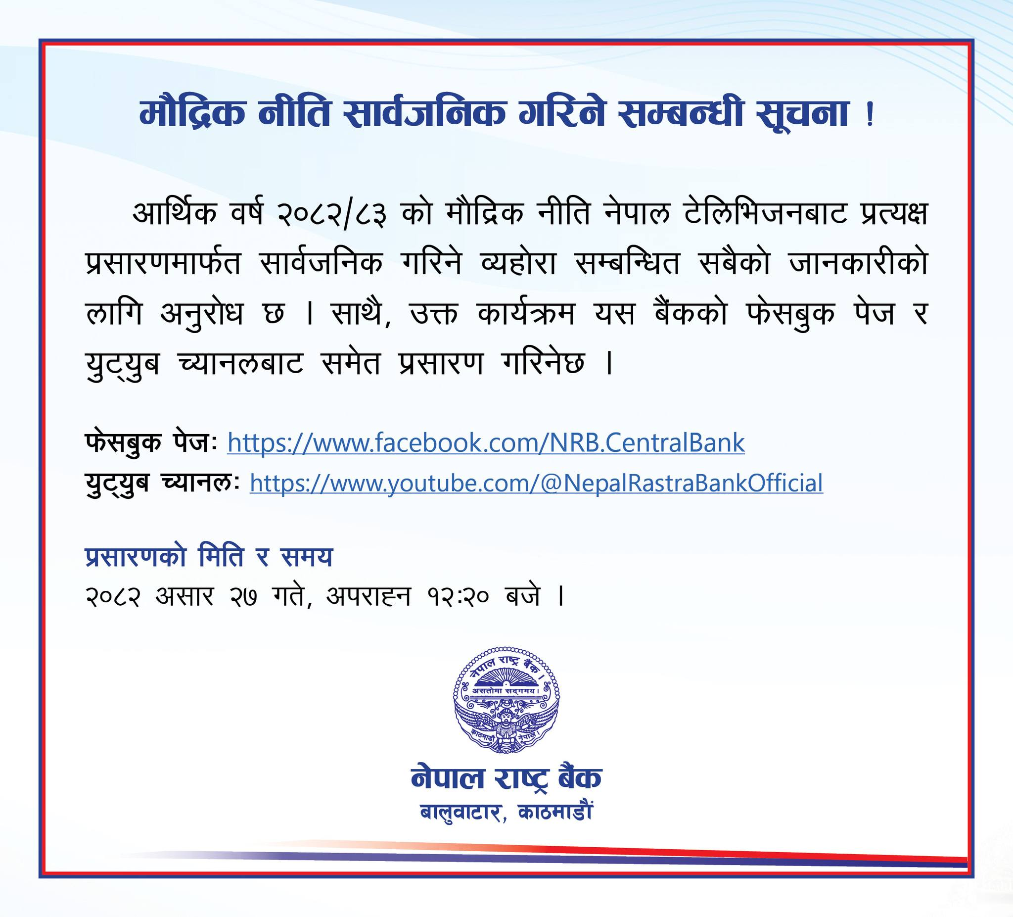 काठमाडौं  । नेपाल राष्ट्र बैंकले आर्थिक वर्ष २०८२/८३ काे मौद्रिक नीति यही असार २७ गते अपराह्न १२:२० बजे सार्वजनिक गर्ने भएको छ। मौद्रिक नीति सार्वजनिक गर्ने कार्यक्रम नेपाल टेलिभिजनबाट प्रत्यक्ष प्रसारण गरिनेछ भने डिजिटल माध्यमबाट समेत देशभरका दर्शक–श्रोताले सजिलै हेर्न सक्ने व्यवस्था मिलाइएको छ।