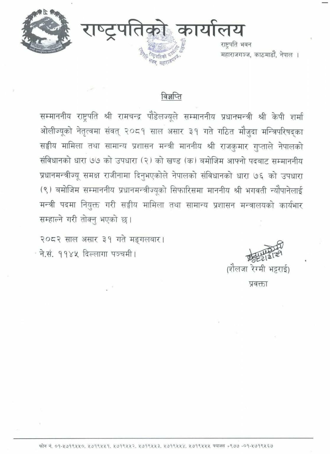 गत सोमबारमात्रै मन्त्रिपरिषद् बैठकमा सहभागी भएका गुप्ताको चौतर्फी आचोलना भएपछि प्रधानमन्त्री ओलीले मंगलबार बिहानै राजीनामा दिन निर्देशन दिएका थिए। त्यसपछि खाली रहेको सामान्य प्रशासन मन्त्रालयको जिम्मेवारी राष्ट्रपति रामचन्द्र पौडेलबाट ओलीको सिफारिसमा एमाले नेतृ न्यौपानेलाई दिइएको हो।