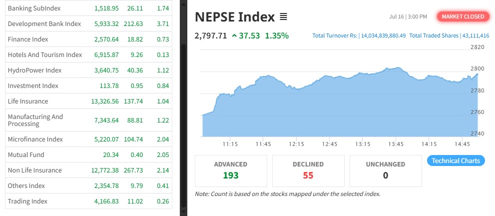 नेपाल स्टक एक्सचेञ्ज (नेप्से) ३७.५३ अकंले बढेर २७९७.७१ बिन्दुमा कायम भएको छ । आज ३३० कम्पनीको ४ करोड ३१ लाख ११ हजार कित्ता शेयर किनबेच हुँदा १४ अर्ब ३ करोड ४८ लाख रुपैयाँको कारोबार भएको छ ।