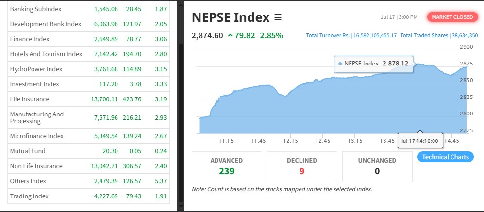 नेपाल स्टक एक्सचेञ्ज (नेप्से) ७९.८२ अकंले बढेर २८७४.६० बिन्दुमा पुगेको छ ।आज ३११ कम्पनीको ३ करोड ८६ लाख ३४ हजार कित्ता शेयर किनबेच हुँदा १६ अर्ब ५९ करोड २१ लाख रुपैयाँको कारोबार भएको छ ।