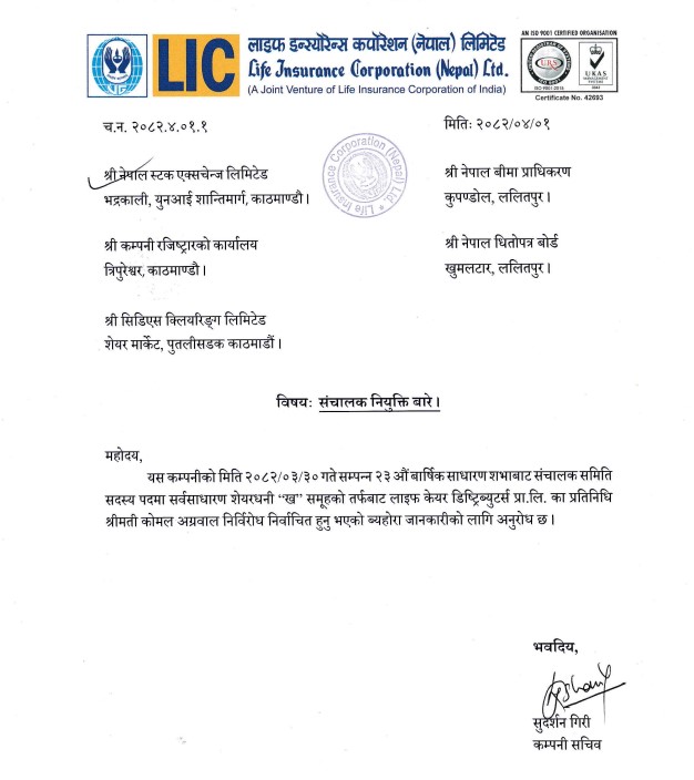 काठमाडौं । लाइफ इन्स्योरेन्स कर्पोरेशन (नेपाल) लिमिटेडको सञ्चालकमा कोमल अग्रवाल नियुक्त भएकीछिन् ।