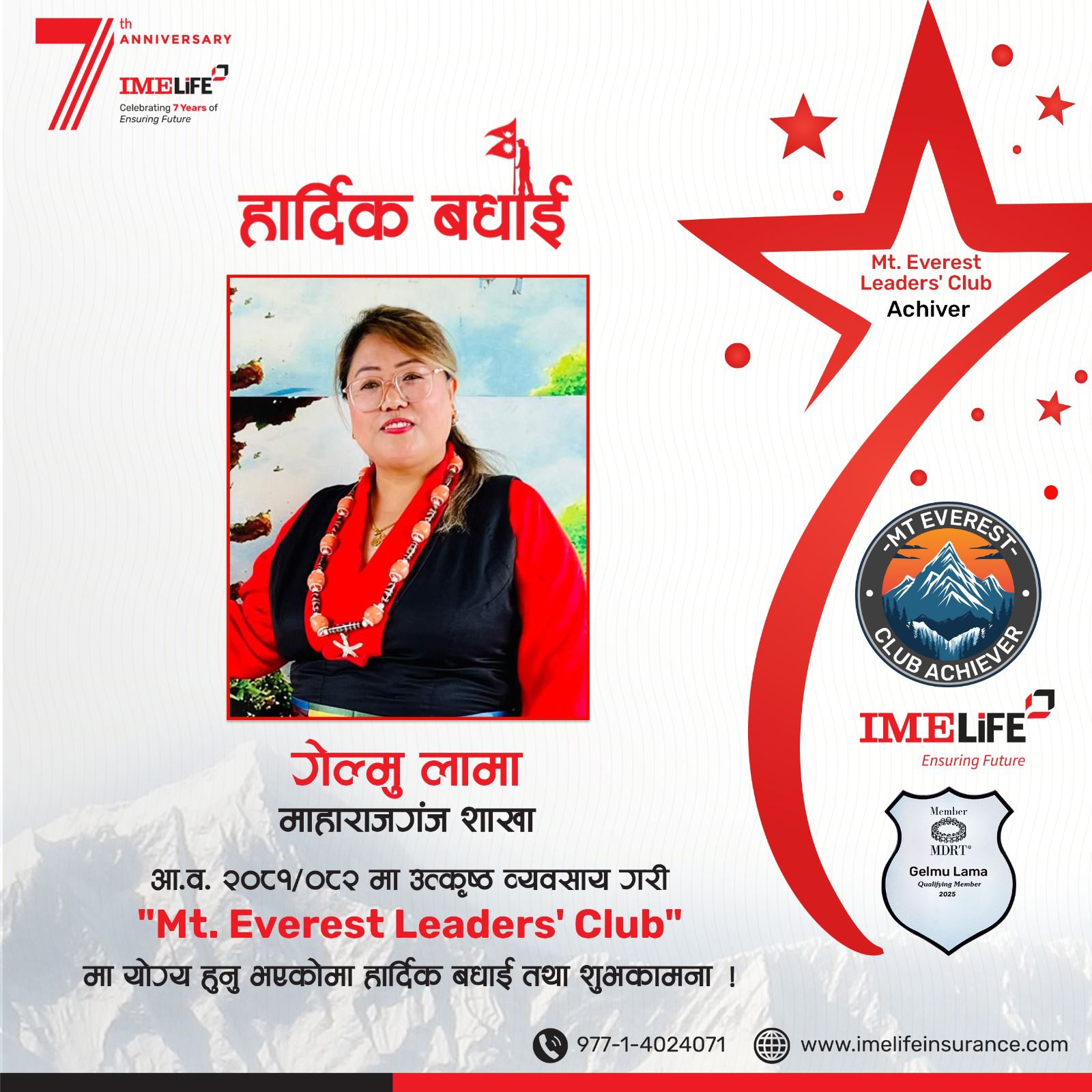 काठमाडौं । आइएमई लाइफ इन्स्योरेन्सकी अभिकर्ता गेल्मु लामाले ऐतिहासिक सफलता हासिल गरेकी छिन् ।