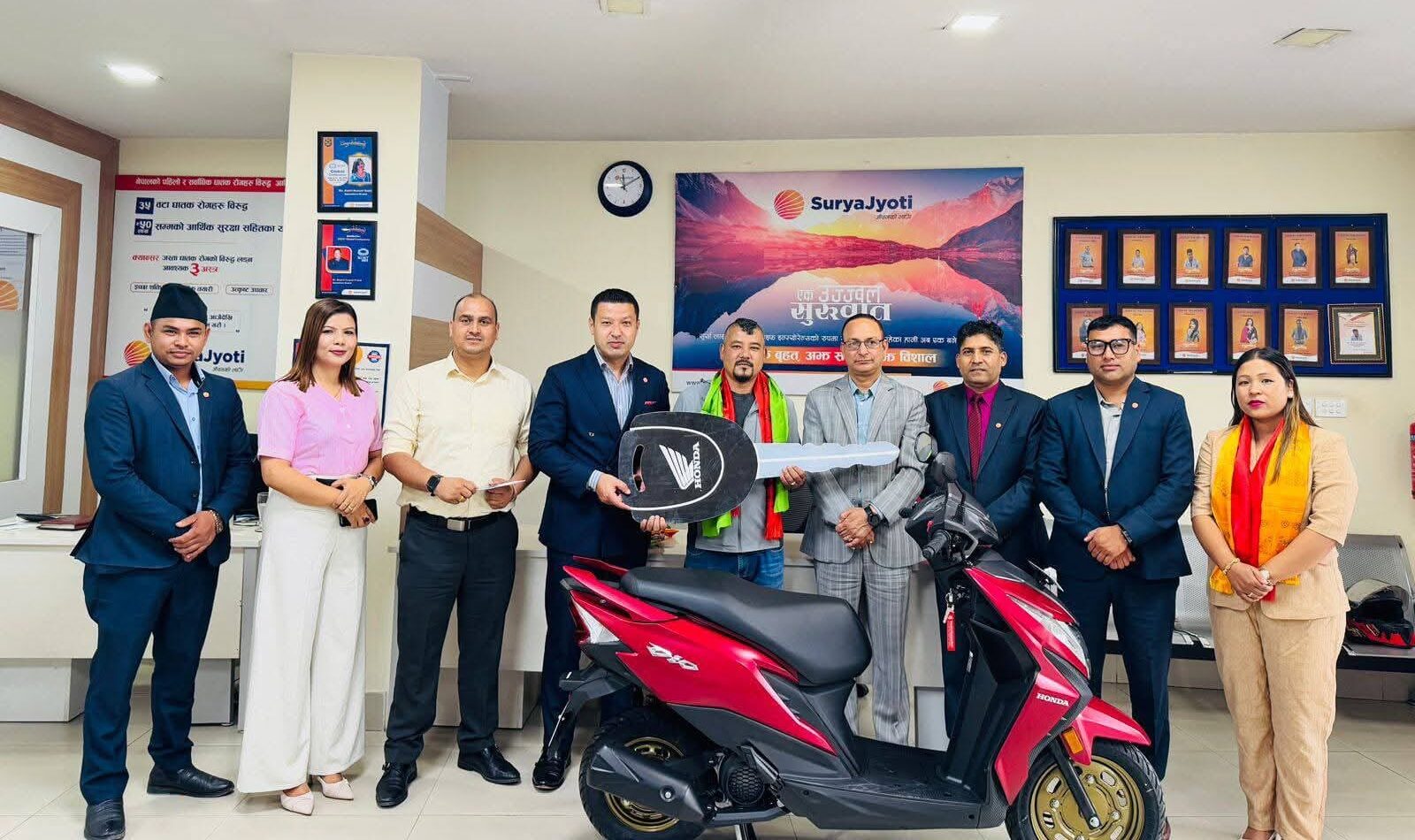 सूर्यज्योति लाइफबाट बारम्बार एमडीआरटी–सीओटी लक्ष्य समेत हासिल गरेका सापकोटाले कम्पनीको असार महिनाको स्कीम पुरा गर्दै स्कुटर समेत जित्न सफल भएका छन् । उनले गत आर्थिक वर्षमा विश्वास गरी बीमा गरीदिने बीमित तथा कम्पनी र सहयोगी सम्पूर्णलाई धन्यवाद समेत व्यक्त गरेका छन् ।