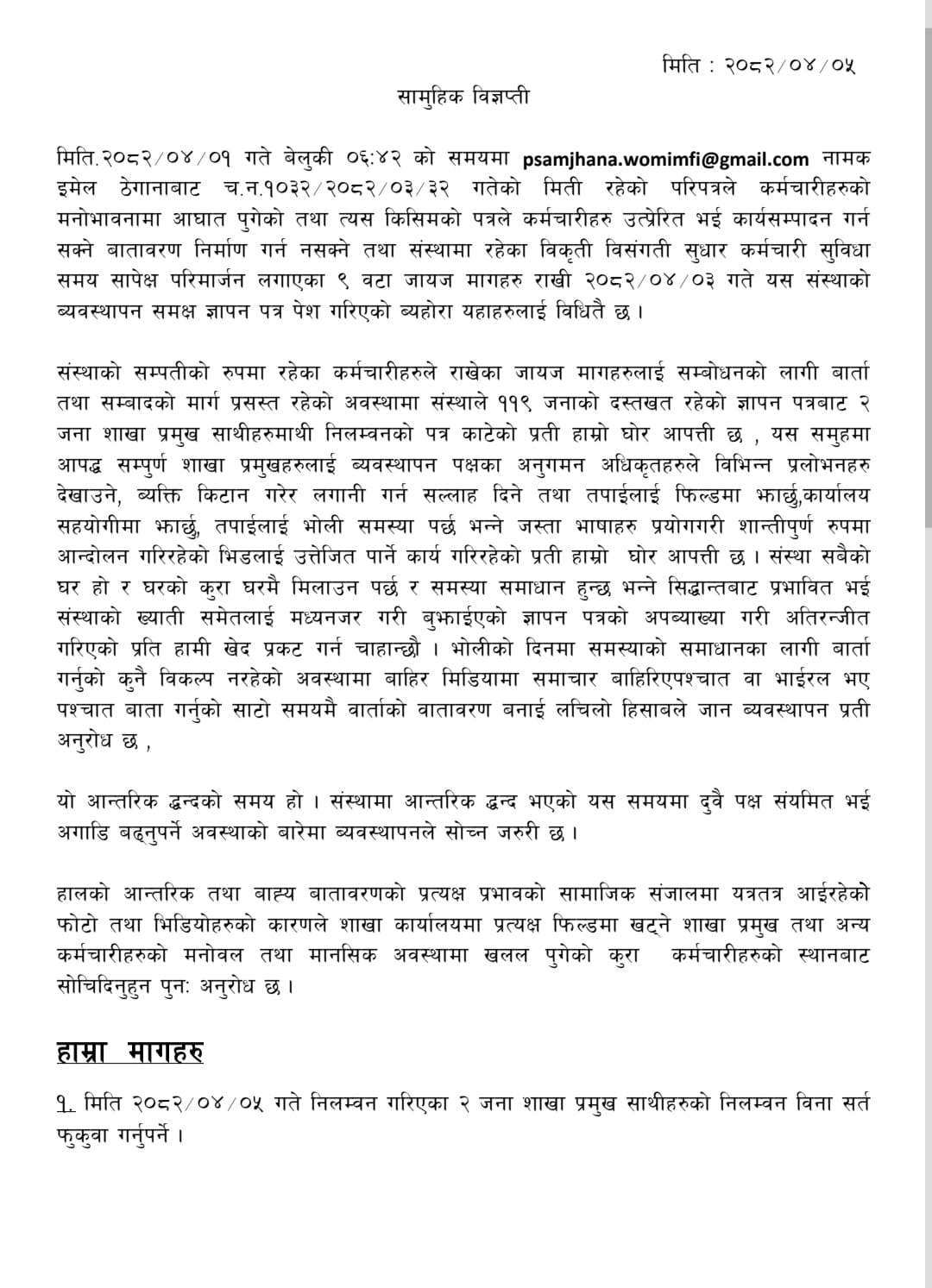 व्यवस्थापनको कमजोरीले कर्मचारीले आत्महत्या नै गर्नुपर्ने सम्मको अवस्था आउन लागेको भन्दै आफ्ना जायज माग तत्काल सम्बोन गर्न माग राखेका छन्।