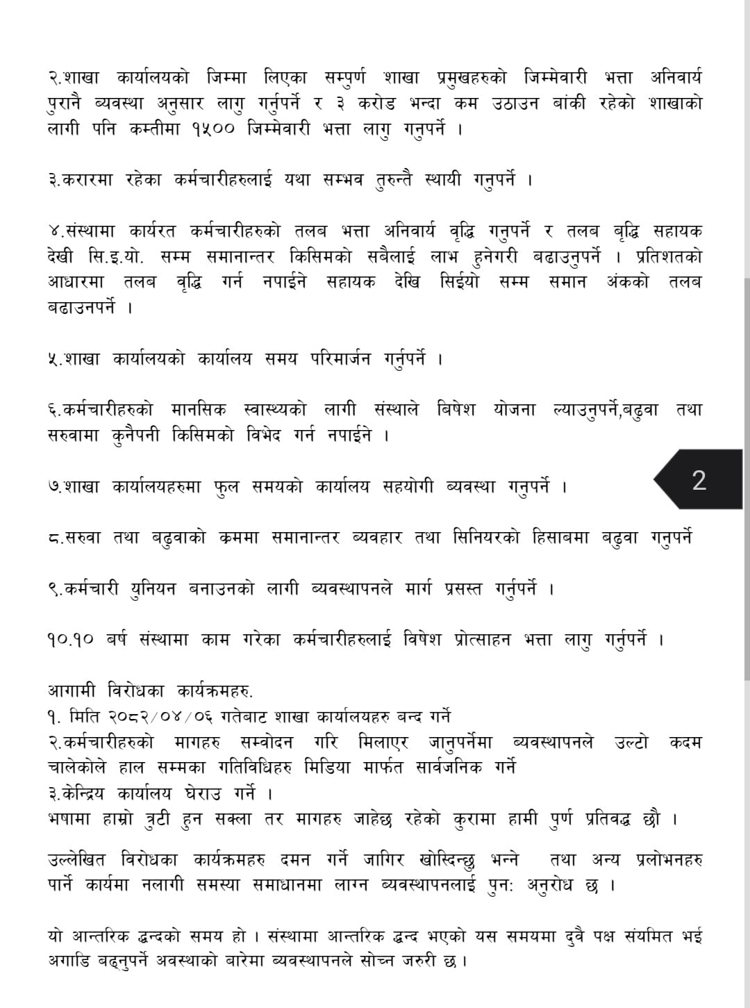 माग सम्बोधन नभए वा आन्दोलन दमन गर्न खोजेमा शाखा कार्यालय बन्द गर्ने र केन्द्रीय कार्यालय घेराउ गर्ने चेतावनी कर्मचारीले दिएका छन्।