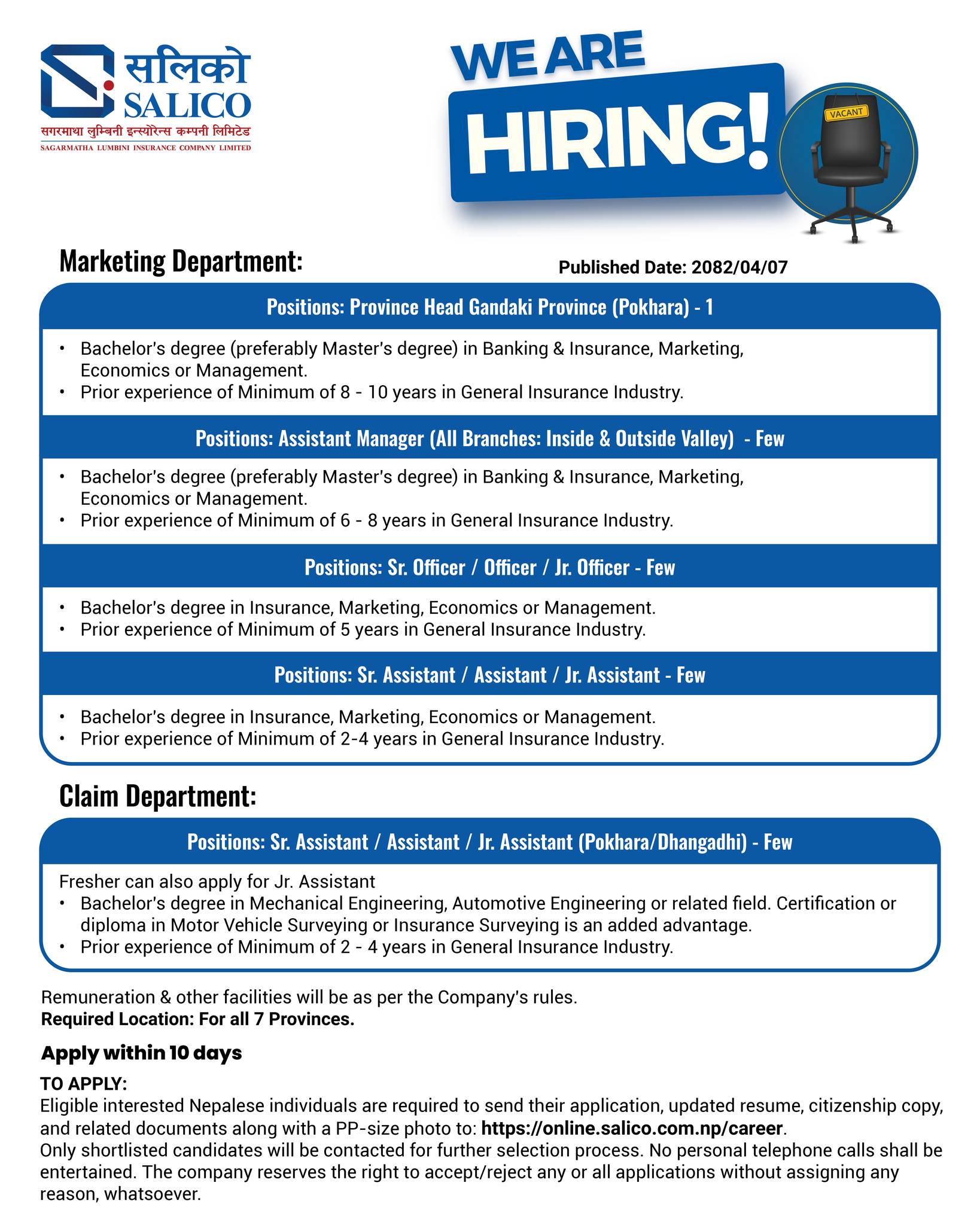 कम्पनीले गण्डकी प्रदेश प्रमुखको लागि एक जना, काठमाडौं उपत्यका र बाहिरका लागि एसिस्टेन्ट म्यानेजर केही जना, सिनियर अफिसर, अफिसर, जे आर अफिसर, तथा एसिस्टेन्ट पदमा केही संख्याले कर्मचारी माग गरेको छ ।