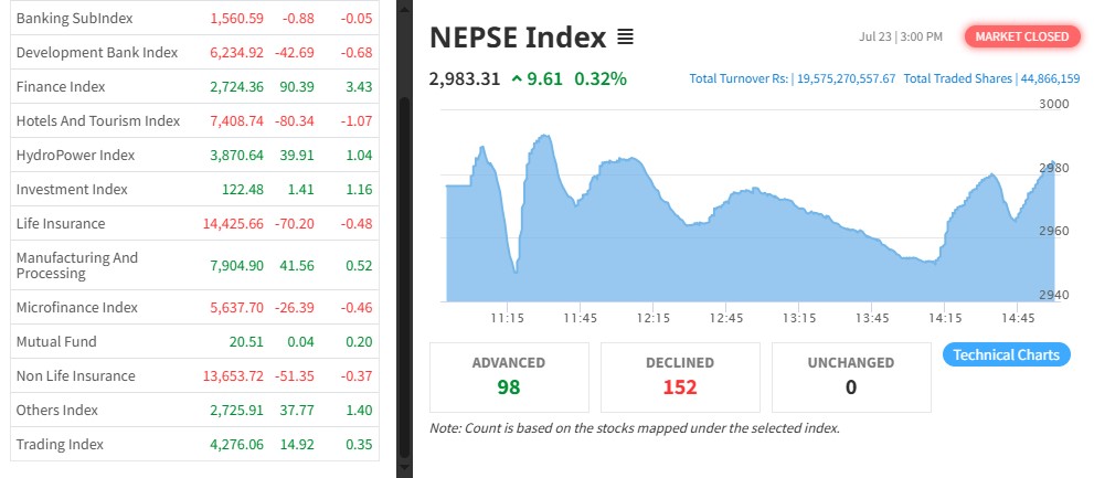 नेपाल स्टक एक्कचेञ्ज (नेप्से) ९.६१ अंंकले बढेर २९८३.३१ बिन्दुमा कायम भएको छ । आज ३१९ कम्पनीको ४ करोड ४८ लाख ६६ हजार कित्ता शेयर किनबेच हुँदा १९ अर्ब ५७ करोड ५२ लाख ७० हजार रुपैयाँको कारोबार भएको छ ।