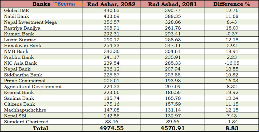 यता, हिमालयन बैंककको ३ खर्ब १३ अर्ब, एभरेष्ट बैंकको ३ खर्ब १ अर्ब, कृषि विकास बैंकको २ खर्ब ९३ अर्ब, एनएमबि बैंकको २ खर्ब ८३ अर्ब, सिद्धार्थ बैंकको २ खर्ब ८३ अर्ब, प्राइम बैंकको २ खर्ब ६८ अर्ब, सानिमा बैंकको २ खर्ब २५ अर्ब र सिटिजन्स बैंकको २ खर्ब १४ अर्ब रुपैयाँ निक्षेप संकलन रहेको छ ।