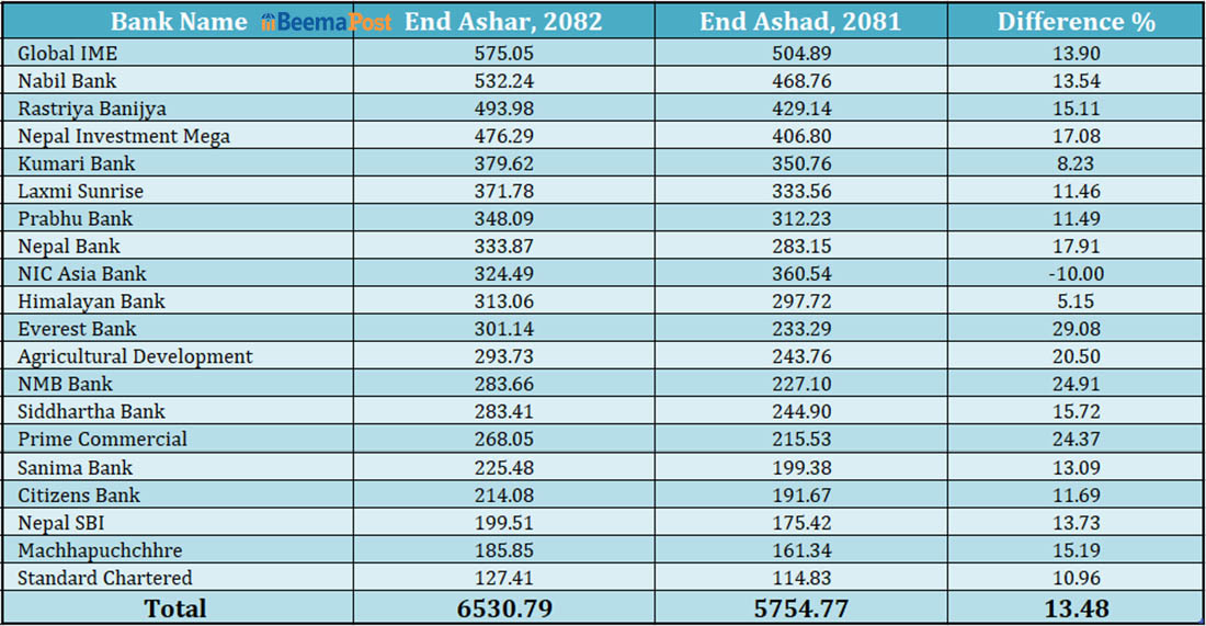 राष्ट्रिय वाणिज्य बैंकको निक्षेप संकलन १५.११ प्रतिशतले बढेर ४ खर्ब ९३ अर्ब, नेपाल इन्भेष्टमेन्ट मेगा बैंकको १७.०८ प्रतिशतले बढेर ४ खर्ब ७६ अर्ब रुपैयाँ, कुमारी बैंकको ८.२३ प्रतिशतले बढेर ३ खर्ब ७९ अर्ब, लक्ष्मी सनराइज बैंकको ११.४६ प्रतिशतले बढेर ३ खर्ब ७१ अर्ब, प्रभु बैंकको ११.४९ प्रतिशतले बढेर ३ खर्ब ४८ अर्ब रुपैयाँ र नेपाल बैंकको १७.९१ प्रतिशतले बढेर ३ खर्ब ३३ अर्ब रुपैयाँ पुगेको छ ।