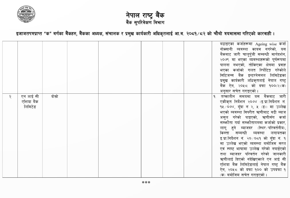 गत आवको चौथो त्रैमासमा एएनआईसी एसिया बैंक पनि राष्ट्र बैंकको कारबाहीमा परेको छ । बैंकले ऋणीबाट बढी ब्याज असुल गरेको पाइएको, ऋणीसँग कर्जा सम्झौता गर्दा सम्झौतापत्रमा कर्जाको प्रकार, लागु हुने ब्याजदर ९स्थिर(परिवर्तनीय०, किस्तासम्बन्धी व्यवस्था लगायत व्यवस्था बमोजिम सरल एवं स्पष्ट भाषामा उल्लेख गरेको नपाइएको भन्दै सचेत गराएको राष्ट्र बैंकले जनाएको छ । बैंकले ब्याजदर परिवर्तन गरेको जानकारी समेत ऋणीलाई दिएको नदेखिएपछि एनआईसी एसियालाई सचेत गराएको केन्द्रीय बैंकले जनाएको छ ।